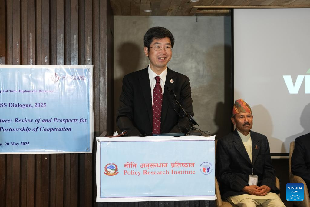 Wang Xin, a counselor at the Chinese Embassy in Nepal, addresses the seminar organized jointly by Nepal's Policy Research Institute and the National Institute of International Strategy under the Chinese Academy of Social Sciences in Kathmandu, Nepal, May 20, 2025. Strategic professionals and scholars from top think tanks of Nepal and China met in the Nepali capital on Tuesday and deliberated on the prospects for bilateral strategic partnership of cooperation on the occasion of the 70th anniversary of diplomatic ties.