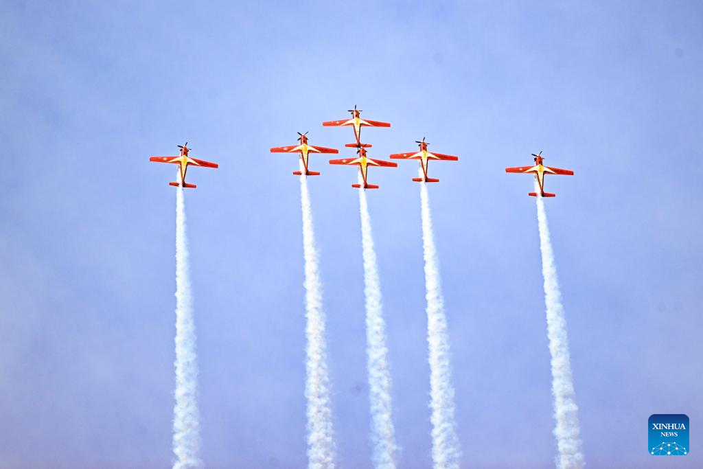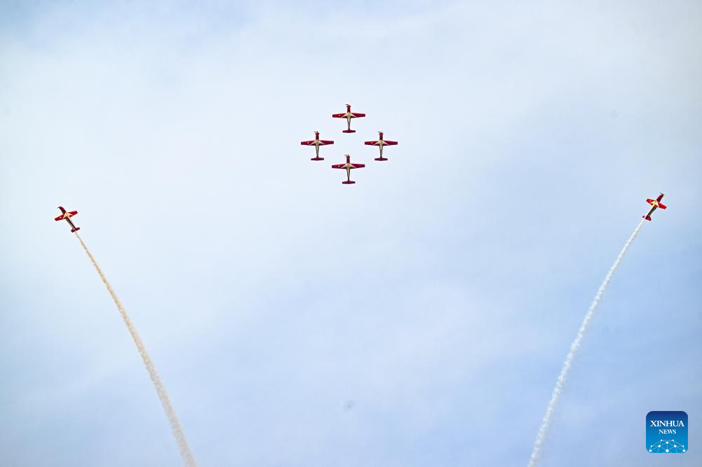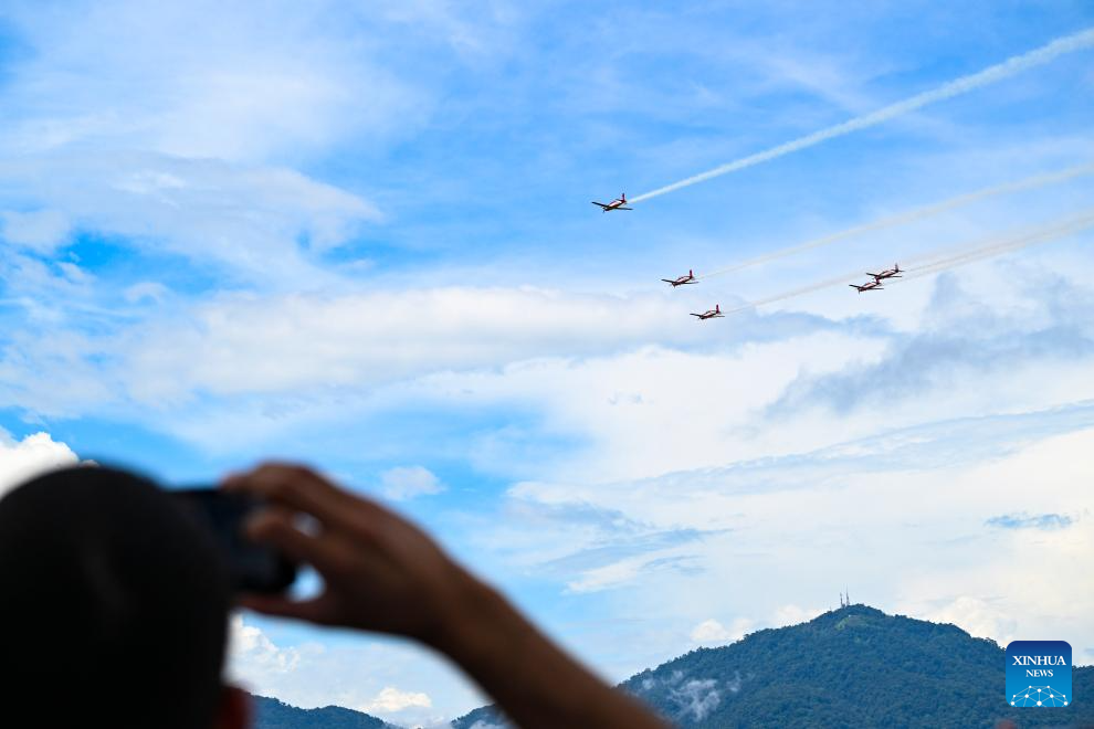 Jupiter Aerobatic Team performs an aerobatic show at the opening ceremony of the 17th edition of the Langkawi International Maritime and Aerospace Exhibition (LIMA) in Langkawi, Malaysia, May 20, 2025. (Xinhua/Ma Ping)