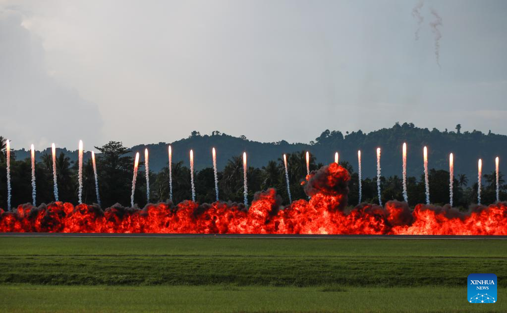 This photo shows a bombardment simulation at the opening ceremony of the 17th edition of the Langkawi International Maritime and Aerospace Exhibition (LIMA) in Langkawi, Malaysia, May 20, 2025. The 17th edition of the Langkawi International Maritime and Aerospace Exhibition (LIMA) kicked off here on Tuesday, with defense and associated companies from around the globe eyeing a higher profile in Asia's defense sector.(Xinhua/Ma Ping)
