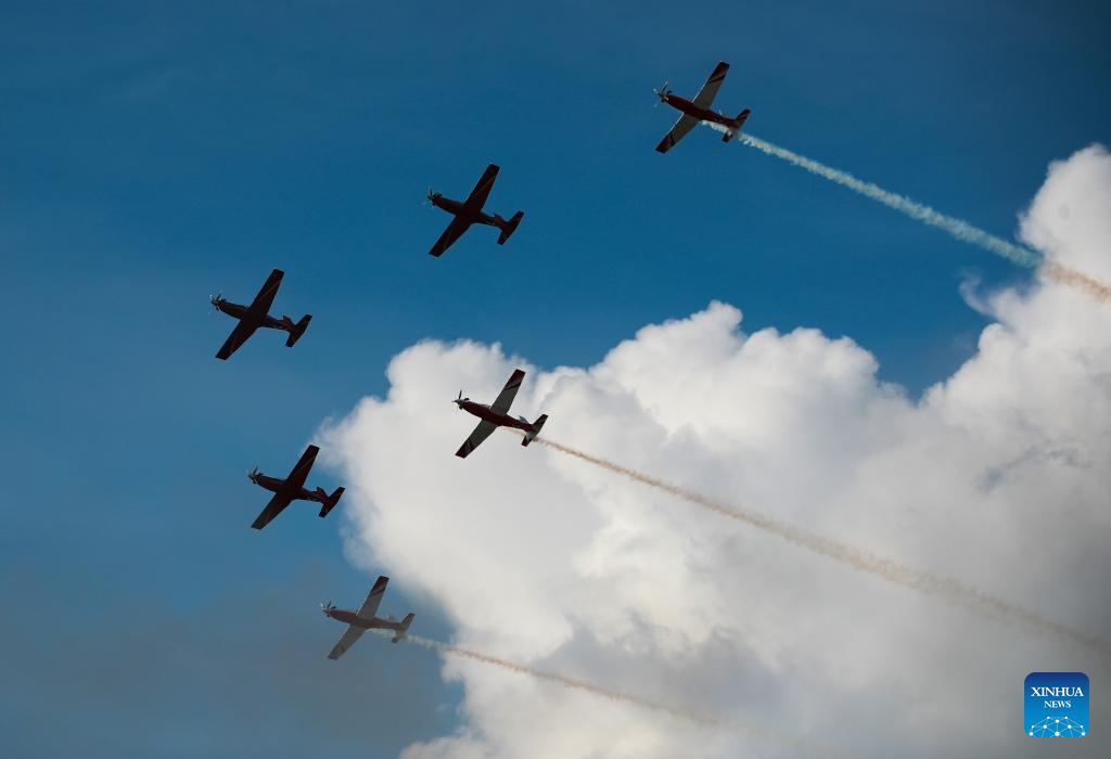 Aircraft perform an aerobatic show at the opening ceremony of the 17th edition of the Langkawi International Maritime and Aerospace Exhibition (LIMA) in Langkawi, Malaysia, May 20, 2025. The 17th edition of the Langkawi International Maritime and Aerospace Exhibition (LIMA) kicked off here on Tuesday, with defense and associated companies from around the globe eyeing a higher profile in Asia's defense sector. (Xinhua/Ma Ping)