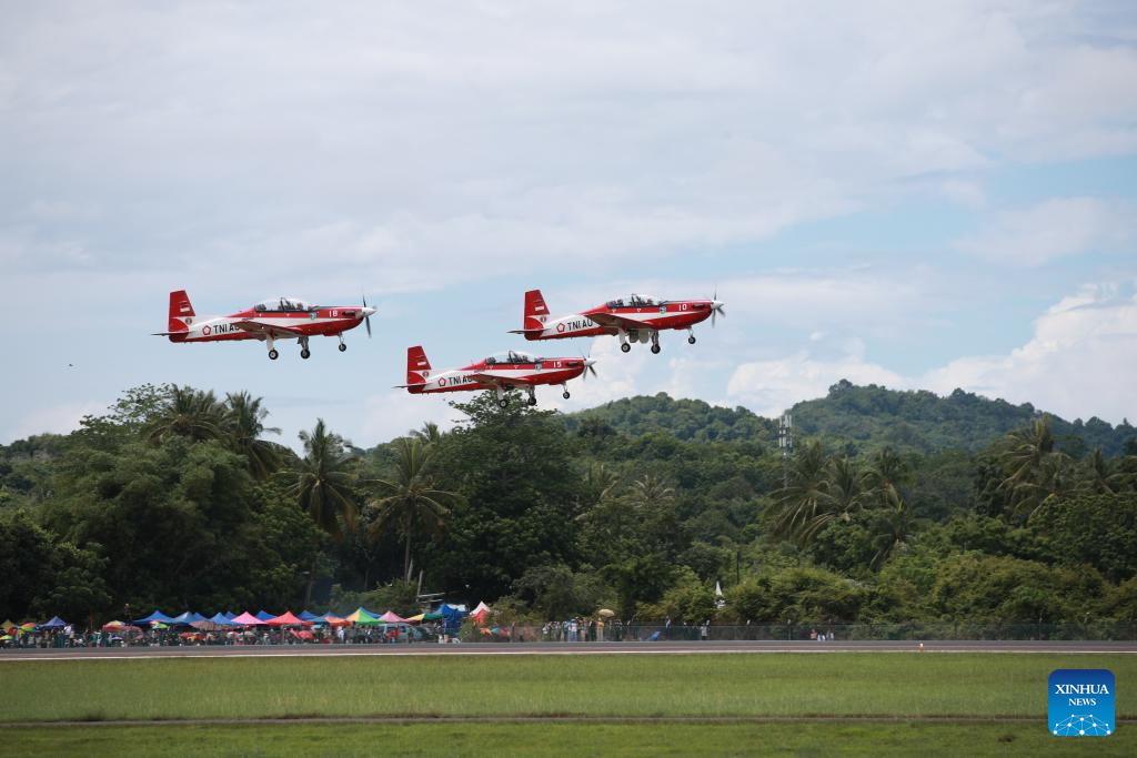 Indonesia's Jupiter aerobatic team takes off before an aerobatic show at the 17th edition of the Langkawi International Maritime and Aerospace Exhibition (LIMA) in Langkawi, Malaysia, May 21, 2025. The 17th edition of the LIMA kicked off here on Tuesday, with defense and associated companies from around the globe eyeing a higher profile in Asia's defense sector. (Xinhua/Ma Ping)