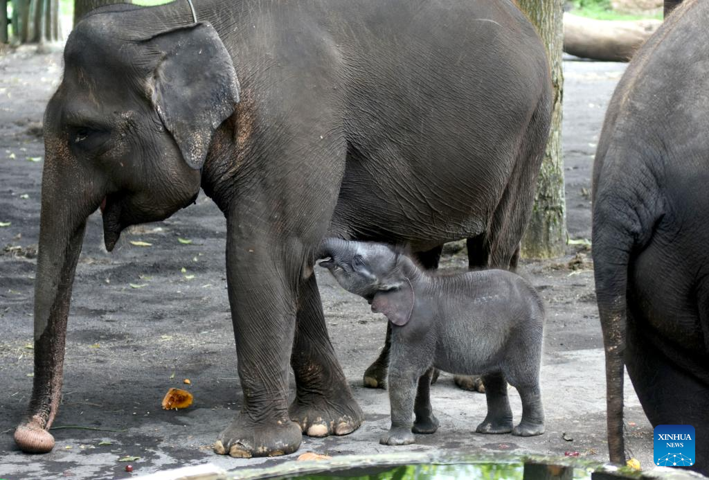 A month-old female baby Sumatran elephant is seen with her mother in Batu Secret Zoo, Batu, East Java, Indonesia, May 21, 2025. A female baby Sumatran elephant was born on April 21 here. (Photo by Aman Rochman/Xinhua)