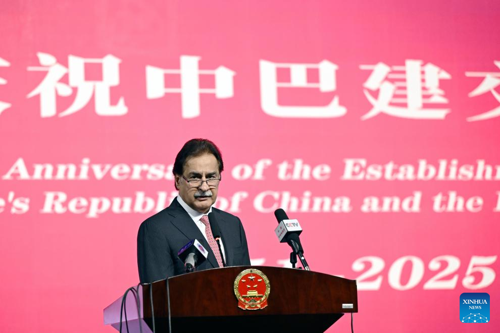 Speaker of Pakistan's national assembly Sardar Ayaz Sadiq speaks during a ceremony marking the 74th anniversary of the establishment of diplomatic ties between China and Pakistan in Islamabad, Pakistan, on May 21, 2025. (Xinhua/Ahmad Kamal)