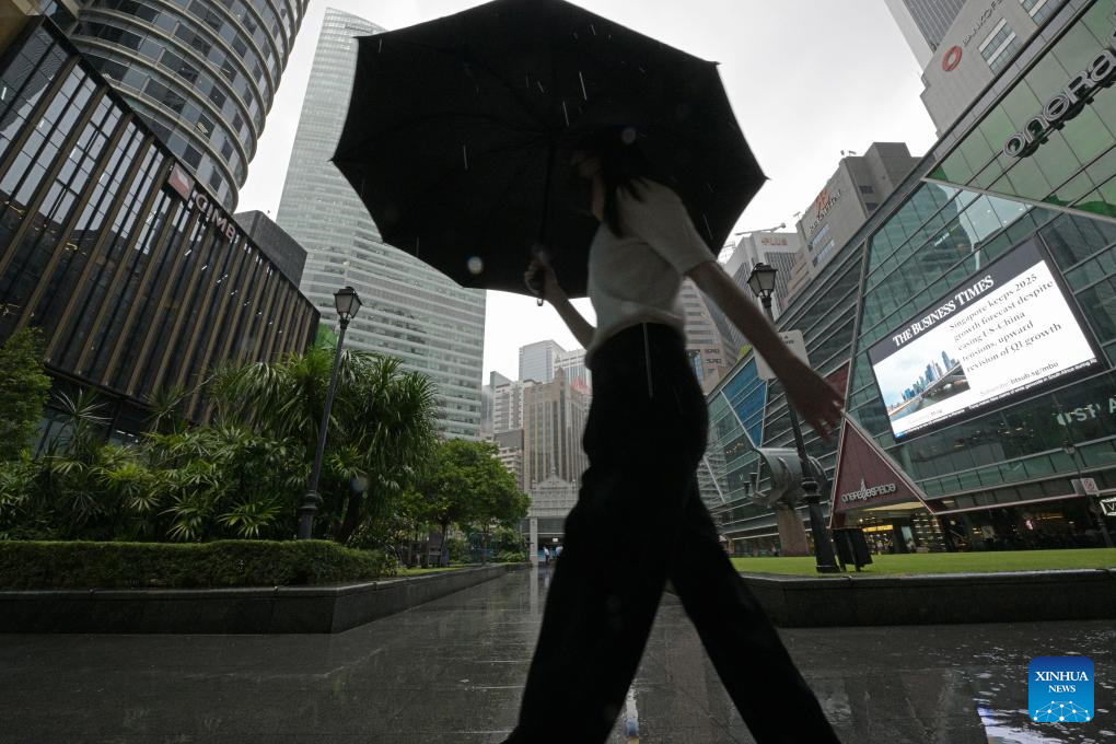 A woman walks in the rain in Singapore's financial and business district Raffles Place on May 22, 2025. Singapore's economy expanded 3.9 percent in the first quarter from a year earlier, easing from 5.0 percent growth in the previous quarter, official data showed on Thursday. (Photo by Then Chih Wey/Xinhua)