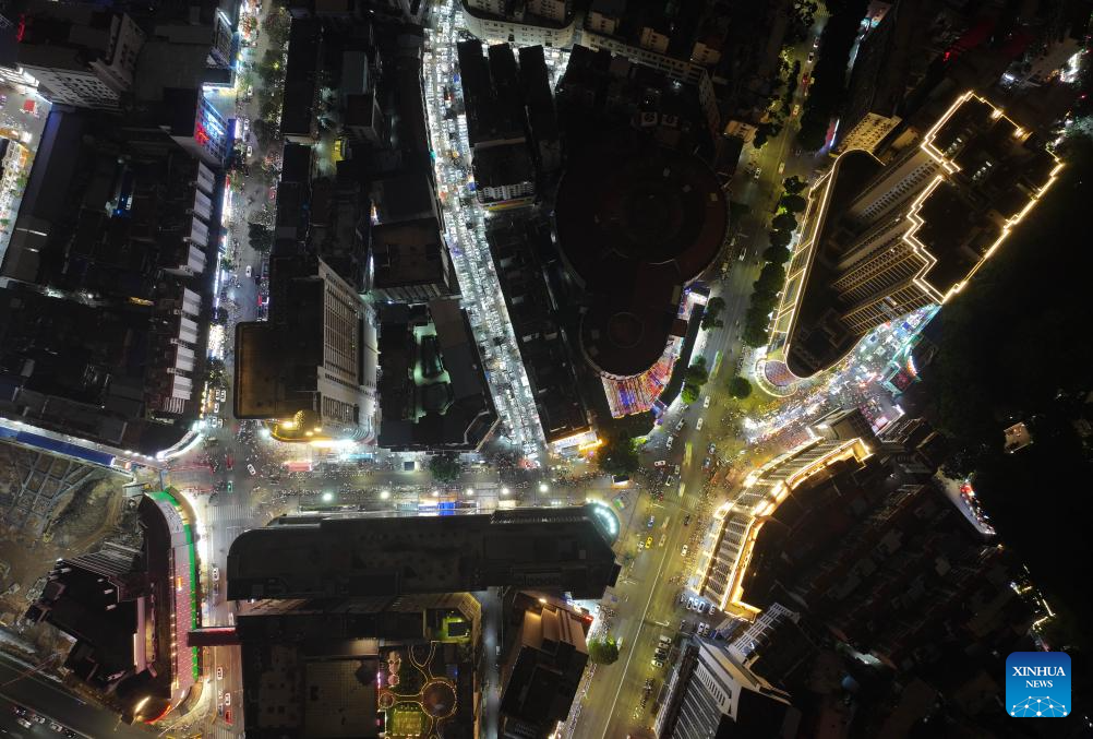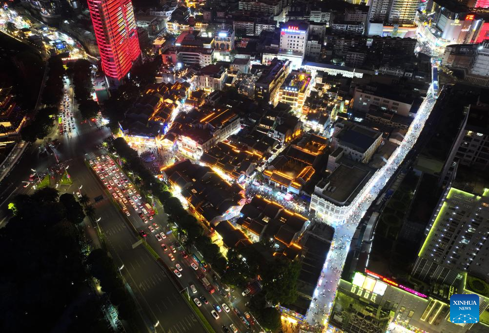 An aerial drone photo taken on April 5, 2025 shows the Xiguan night market and its surroundings in Nanning, south China's Guangxi Zhuang Autonomous Region. Nighttime economy refers to business activities between 6 p.m. and 6 a.m. In recent years, Nanning has been continuously focusing on the upgrade of consumption experience and promoting the integration of cultural tourism and commerce. Various night fairs and booths across the city have boosted consumption and injected vitality into the city's night economy. (Xinhua/Huang Xiaobang)