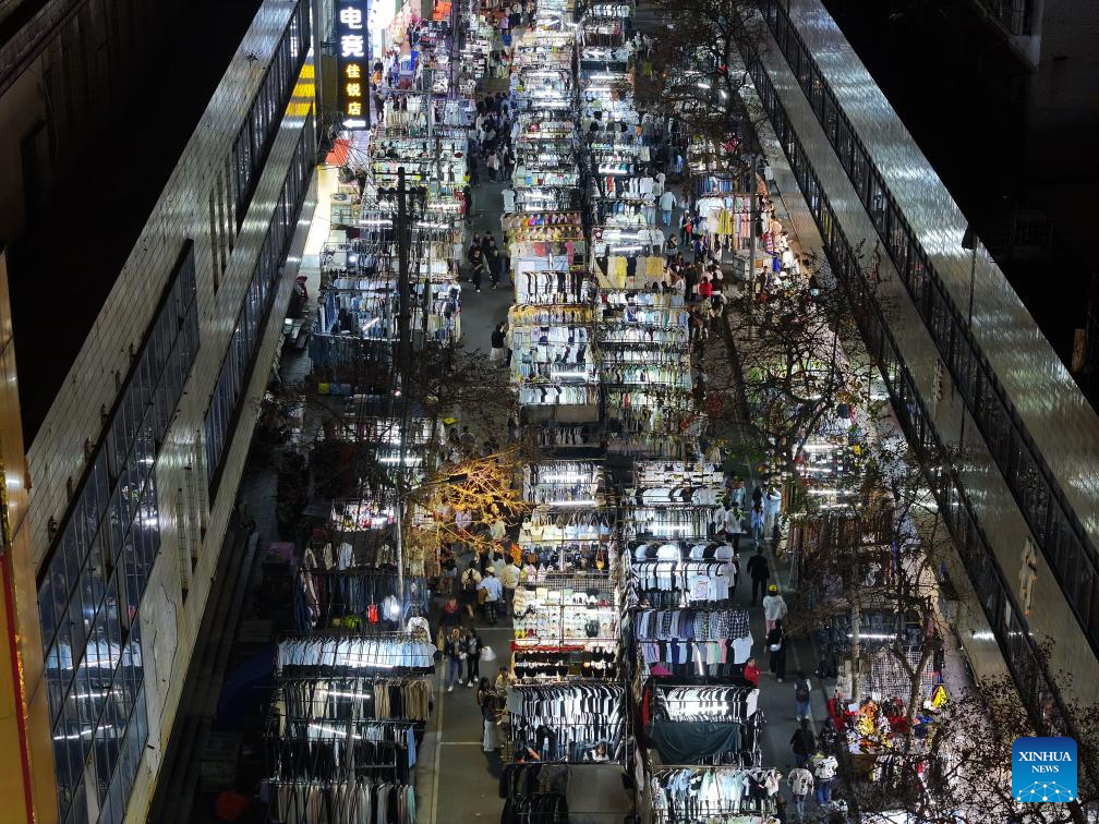An aerial drone photo taken on April 5, 2025 shows the Xiguan night market in Nanning, south China's Guangxi Zhuang Autonomous Region. Nighttime economy refers to business activities between 6 p.m. and 6 a.m. In recent years, Nanning has been continuously focusing on the upgrade of consumption experience and promoting the integration of cultural tourism and commerce. Various night fairs and booths across the city have boosted consumption and injected vitality into the city's night economy. (Xinhua/Huang Xiaobang)