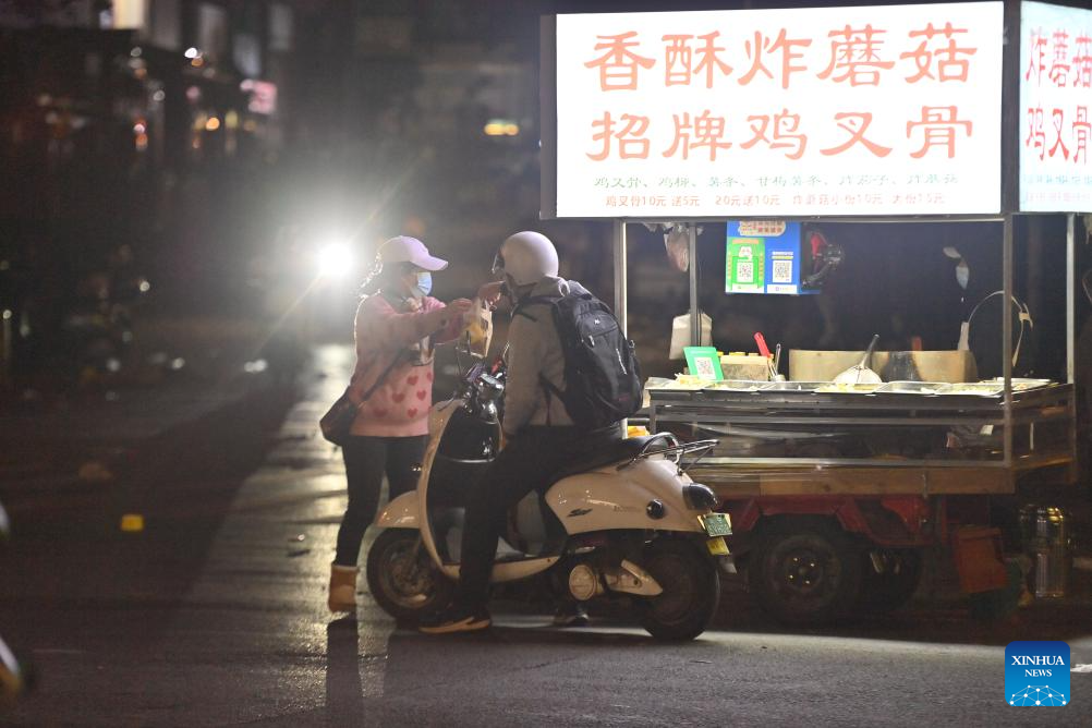 People buy snacks at the Xiguan night market in Nanning, south China's Guangxi Zhuang Autonomous Region, March 29, 2025. Nighttime economy refers to business activities between 6 p.m. and 6 a.m. In recent years, Nanning has been continuously focusing on the upgrade of consumption experience and promoting the integration of cultural tourism and commerce. Various night fairs and booths across the city have boosted consumption and injected vitality into the city's night economy. (Xinhua/Huang Xiaobang)