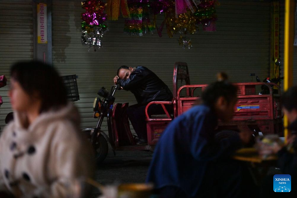 A vendor is seen napping at the Xiguan night market in Nanning, south China's Guangxi Zhuang Autonomous Region, March 30, 2025. Nighttime economy refers to business activities between 6 p.m. and 6 a.m. In recent years, Nanning has been continuously focusing on the upgrade of consumption experience and promoting the integration of cultural tourism and commerce. Various night fairs and booths across the city have boosted consumption and injected vitality into the city's night economy. (Xinhua/Huang Xiaobang)