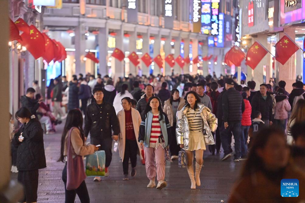 People wander at a commercial strip in Nanning, south China's Guangxi Zhuang Autonomous Region, March 31, 2025. Nighttime economy refers to business activities between 6 p.m. and 6 a.m. In recent years, Nanning has been continuously focusing on the upgrade of consumption experience and promoting the integration of cultural tourism and commerce. Various night fairs and booths across the city have boosted consumption and injected vitality into the city's night economy. (Xinhua/Huang Xiaobang)