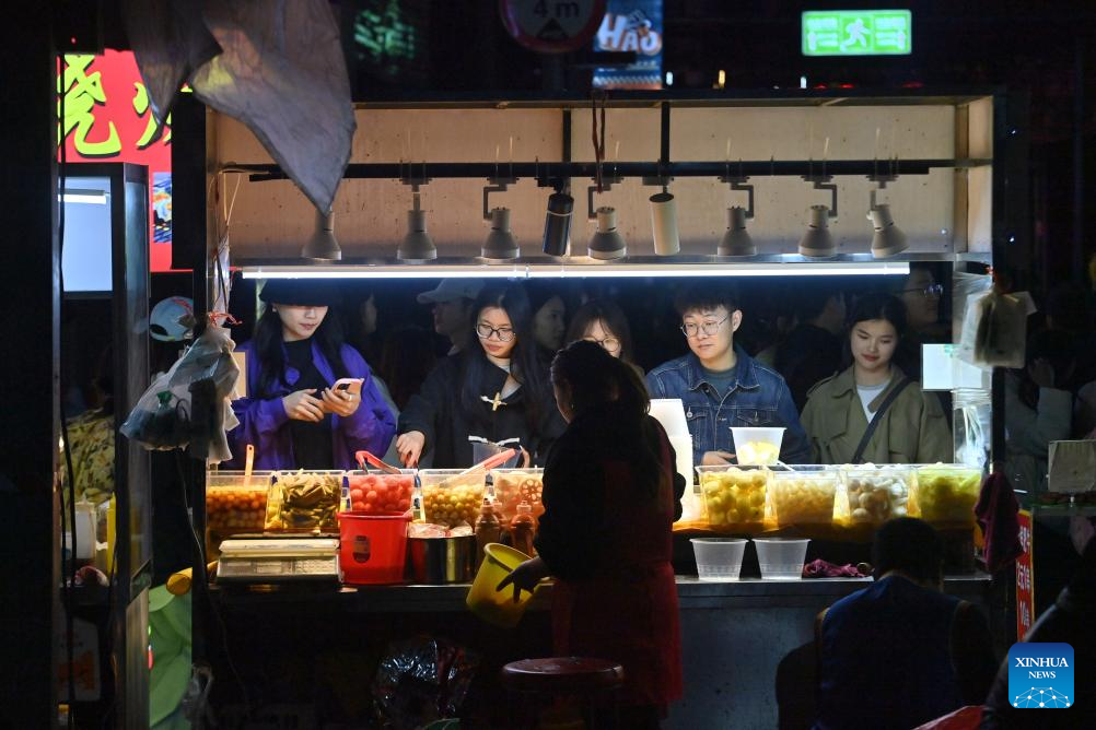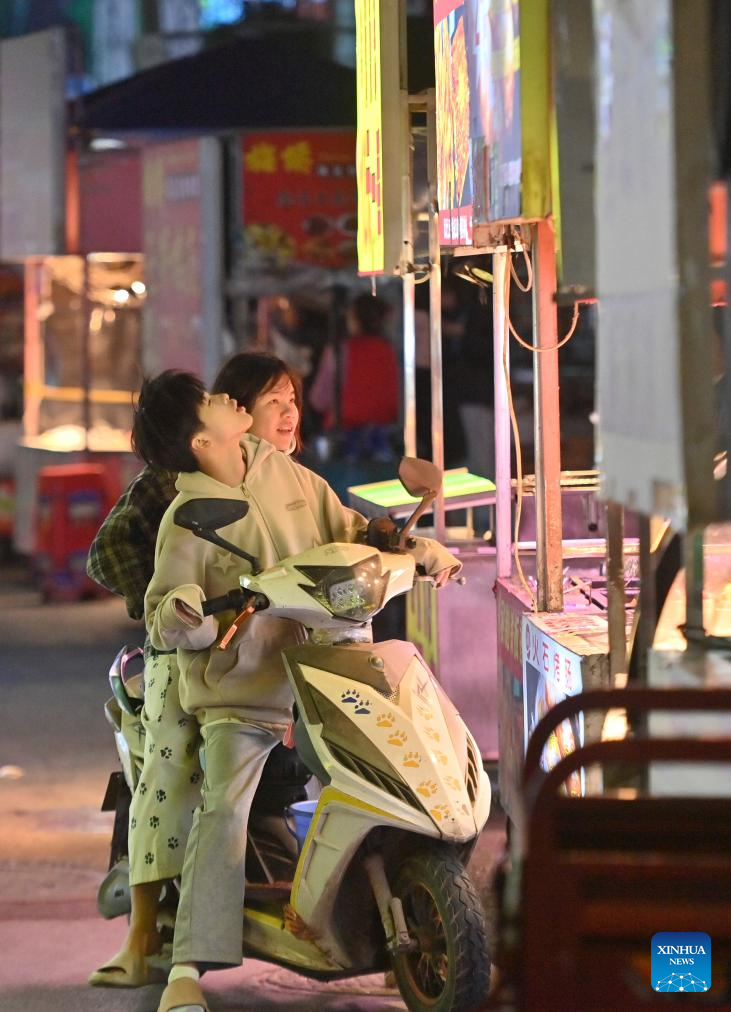 People choose snacks at the Xiguan night market in Nanning, south China's Guangxi Zhuang Autonomous Region, March 30, 2025. Nighttime economy refers to business activities between 6 p.m. and 6 a.m. In recent years, Nanning has been continuously focusing on the upgrade of consumption experience and promoting the integration of cultural tourism and commerce. Various night fairs and booths across the city have boosted consumption and injected vitality into the city's night economy. (Xinhua/Huang Xiaobang)