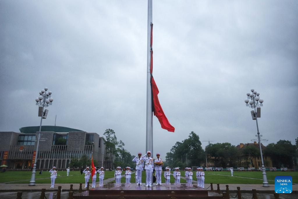 A ceremony to lower the flag at half-mast is held at Ba Dinh Square in Hanoi, the capital of Vietnam, May 24, 2025. A respect-paying ceremony for former Vietnamese President Tran Duc Luong began on Saturday morning at the National Funeral Hall in the capital Hanoi, Vietnam News Agency (VNA) reported. (VNA via Xinhua)