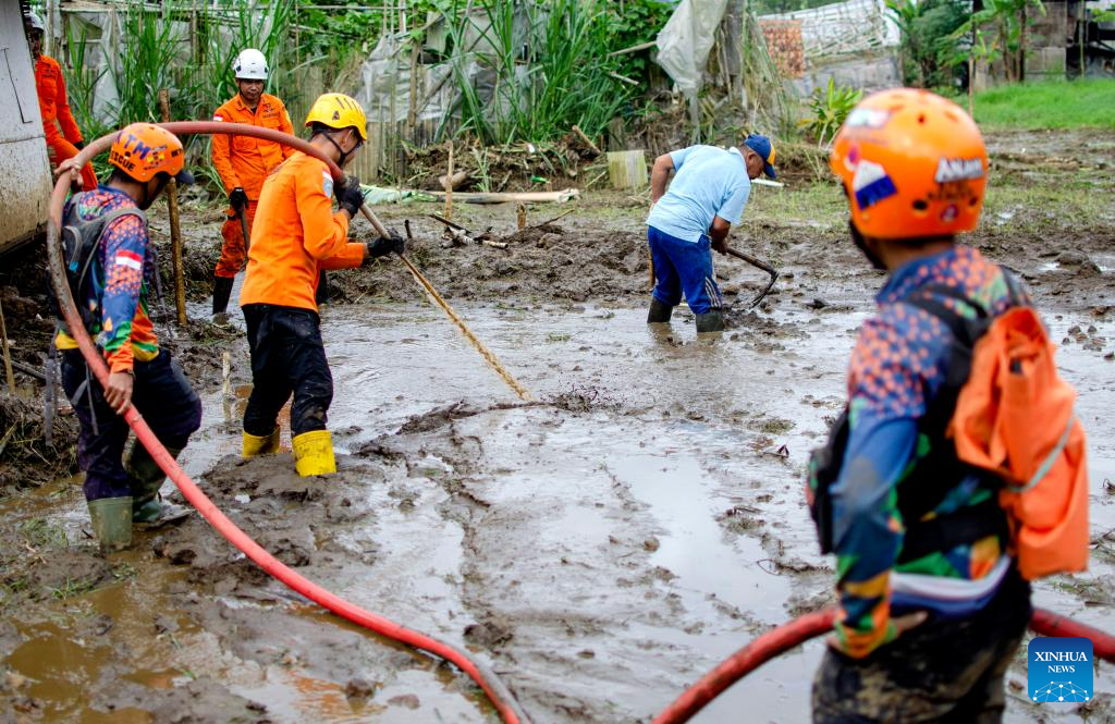 Rescue teams clean a muddy area after flood and landslide hit at Cikahuripan village in Bandung Regency, West Java, Indonesia, May 26, 2025. (Photo by Septianjar Muharam/Xinhua)