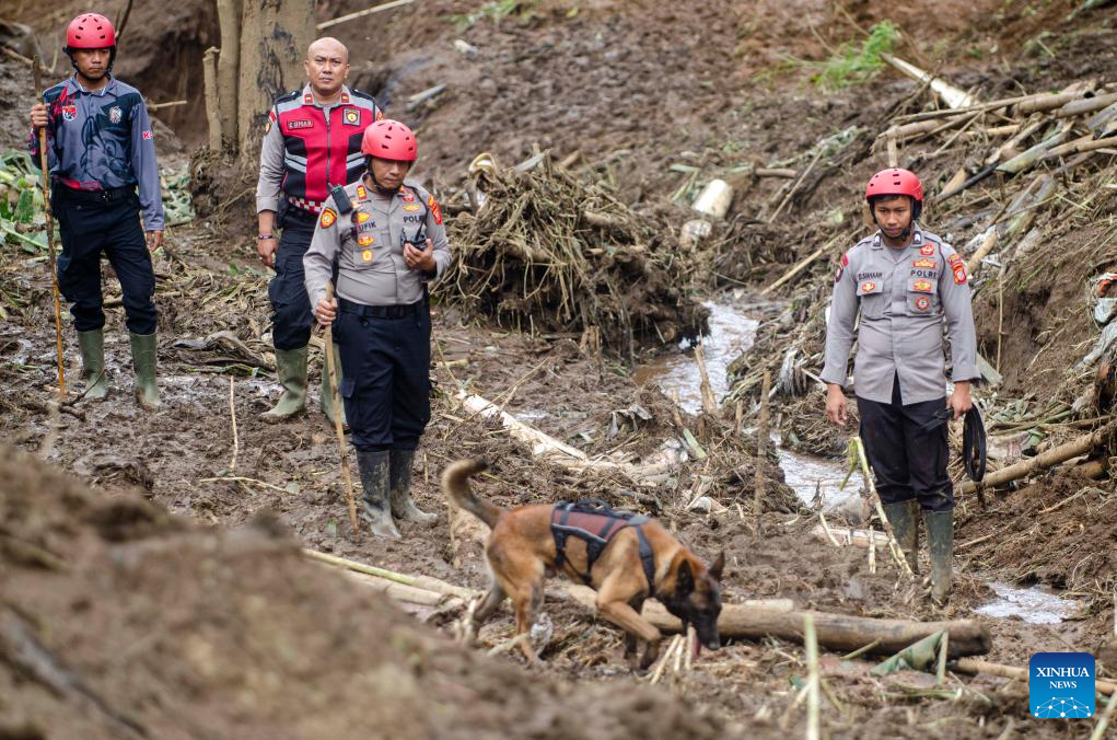 Police officers and a sniffer dog conduct rescue work after flood and landslide hit at Cikahuripan village in Bandung Regency, West Java, Indonesia, May 26, 2025. (Photo by Septianjar Muharam/Xinhua)