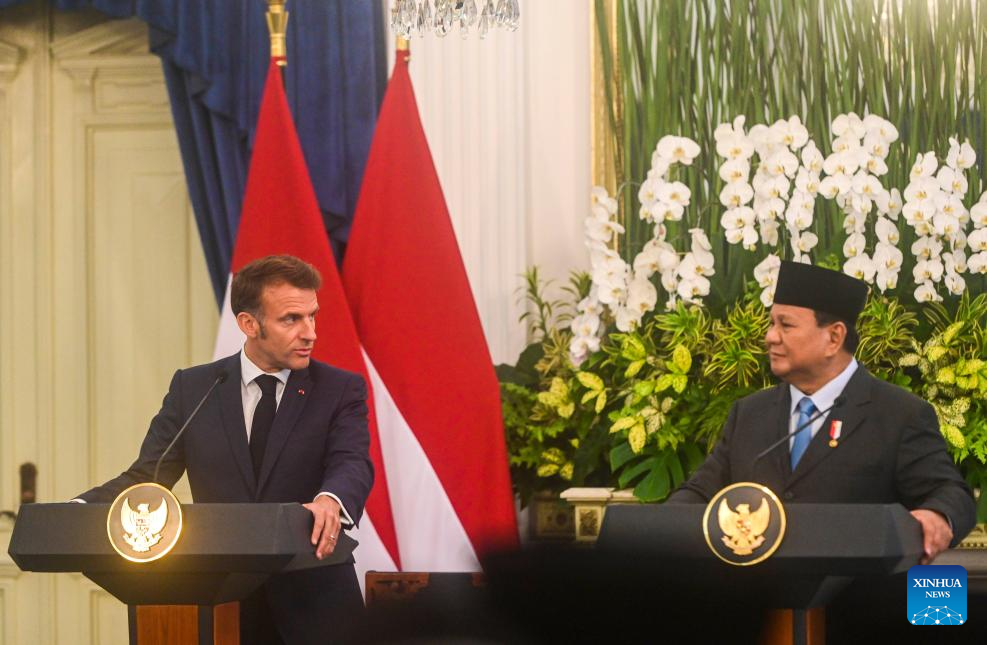 French President Emmanuel Macron (L) and Indonesian President Prabowo Subianto attend a joint press conference at Merdeka Palace in Jakarta, Indonesia, May 28, 2025. Indonesian President Prabowo Subianto on Wednesday hosted French President Emmanuel Macron in Jakarta for high-level talks covering key sectors such as defense, energy, economy, investment, education, and transportation. (Xinhua/Zulkarnain)