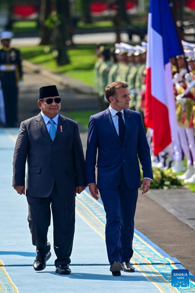 JAKARTA, May 28 (Xinhua) -- Indonesian President Prabowo Subianto on Wednesday hosted French President Emmanuel Macron in Jakarta for high-level talks covering key sectors such as defense, energy, economy, investment, education, and transportation.
