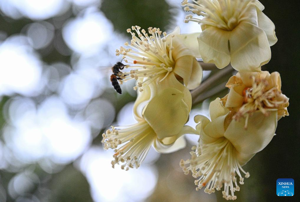 A bee rests on the flowers of a durian tree at a durian industry park in Baoting Li and Miao Autonomous County, south China's Hainan Province, May 24, 2025. In recent years, Baoting Li and Miao Autonomous County in Hainan Province has vigorously developed its durian planting industry, with the cultivation area continuously expanding. By the end of 2024, the durian planting area in Baoting had exceeded 666.7 hectares. The growing durian industry has become a new growth point for the local economy and a new support for rural revitalization. (Xinhua/Pu Xiaoxu)