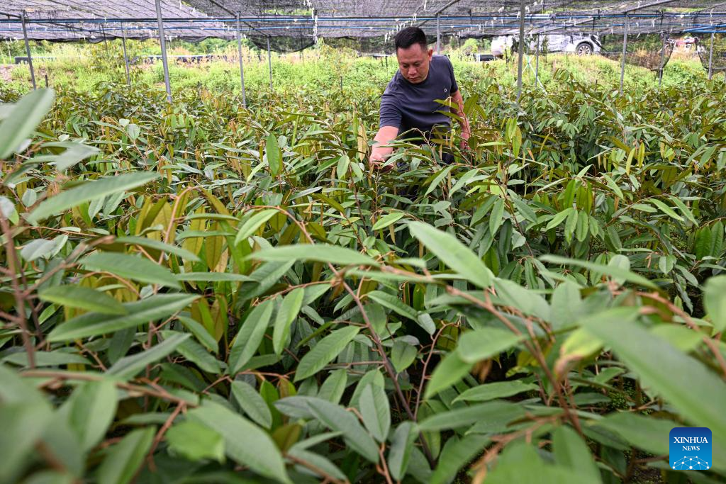 A staff member checks the growth of durian seedlings at a durian industry park in Baoting Li and Miao Autonomous County, south China's Hainan Province, May 24, 2025. In recent years, Baoting Li and Miao Autonomous County in Hainan Province has vigorously developed its durian planting industry, with the cultivation area continuously expanding. By the end of 2024, the durian planting area in Baoting had exceeded 666.7 hectares. The growing durian industry has become a new growth point for the local economy and a new support for rural revitalization. (Xinhua/Pu Xiaoxu)