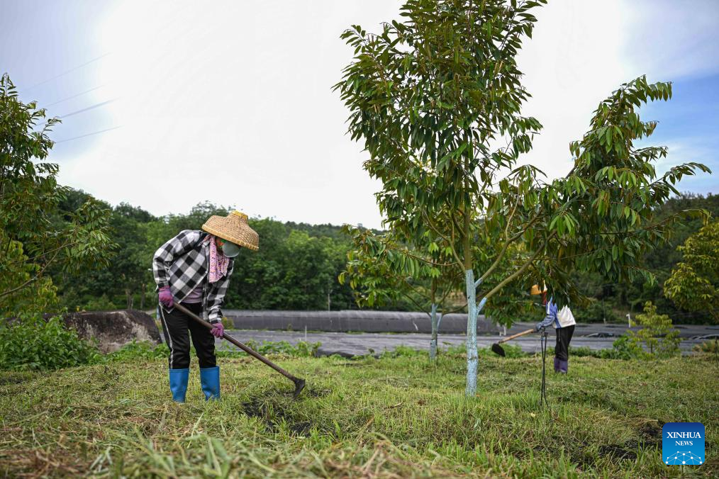 Farmers work at a durian industry park in Baoting Li and Miao Autonomous County, south China's Hainan Province, May 24, 2025. In recent years, Baoting Li and Miao Autonomous County in Hainan Province has vigorously developed its durian planting industry, with the cultivation area continuously expanding. By the end of 2024, the durian planting area in Baoting had exceeded 666.7 hectares. The growing durian industry has become a new growth point for the local economy and a new support for rural revitalization. (Xinhua/Pu Xiaoxu)