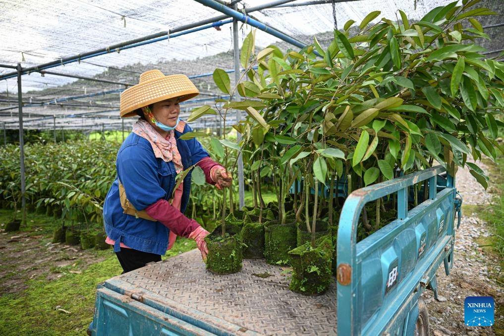A farmer transports durian seedlings at a durian industry park in Baoting Li and Miao Autonomous County, south China's Hainan Province, May 24, 2025. In recent years, Baoting Li and Miao Autonomous County in Hainan Province has vigorously developed its durian planting industry, with the cultivation area continuously expanding. By the end of 2024, the durian planting area in Baoting had exceeded 666.7 hectares. The growing durian industry has become a new growth point for the local economy and a new support for rural revitalization. (Xinhua/Pu Xiaoxu)