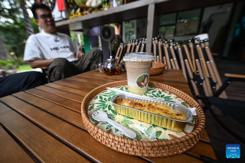 This photo taken on May 26, 2025 shows durian dessert and durian-flavored coffee in Baoting Li and Miao Autonomous County, south China's Hainan Province. In recent years, Baoting Li and Miao Autonomous County in Hainan Province has vigorously developed its durian planting industry, with the cultivation area continuously expanding. By the end of 2024, the durian planting area in Baoting had exceeded 666.7 hectares. The growing durian industry has become a new growth point for the local economy and a new support for rural revitalization. (Xinhua/Pu Xiaoxu)