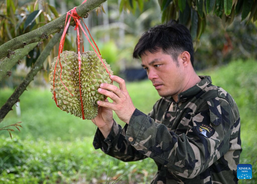 A staff member checks the growth of durian fruits at a durian industry park in Baoting Li and Miao Autonomous County, south China's Hainan Province, May 23, 2025. In recent years, Baoting Li and Miao Autonomous County in Hainan Province has vigorously developed its durian planting industry, with the cultivation area continuously expanding. By the end of 2024, the durian planting area in Baoting had exceeded 666.7 hectares. The growing durian industry has become a new growth point for the local economy and a new support for rural revitalization. (Xinhua/Pu Xiaoxu)
