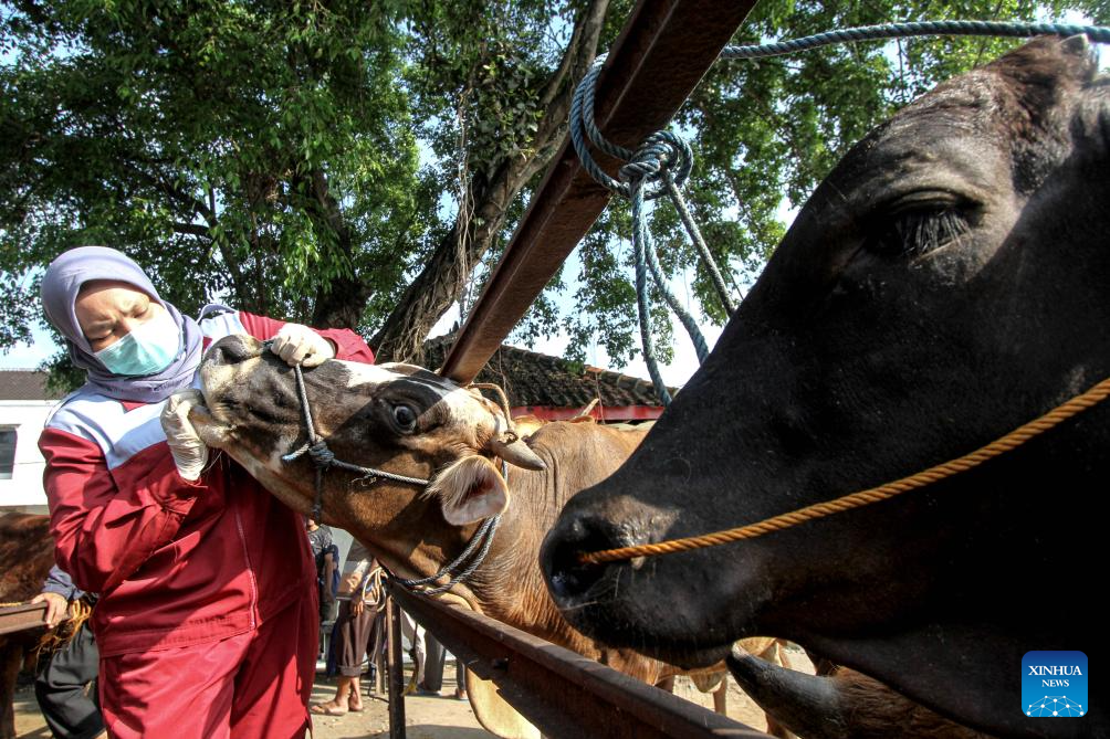 A veterinarian checks the mouth health of a cow ahead of Eid Al-Adha at Bekonang livestock market in Sukoharjpo Regency, Central Java, Indonesia, May 28, 2025. (Photo by Bram Selo/Xinhua)