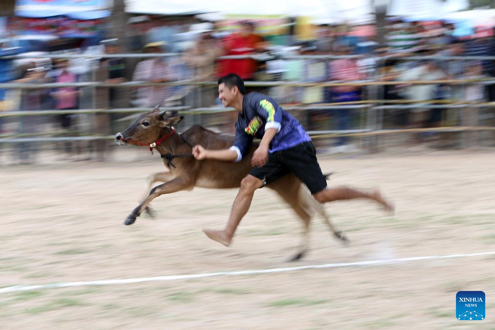 A contestant runs with an ox in Phetchaburi Province, Thailand, on May 28, 2025. Ox cart racing is an annual event held in Phetchaburi to celebrate the end of harvest season. (Xinhua/Rachen Sageamsak)
