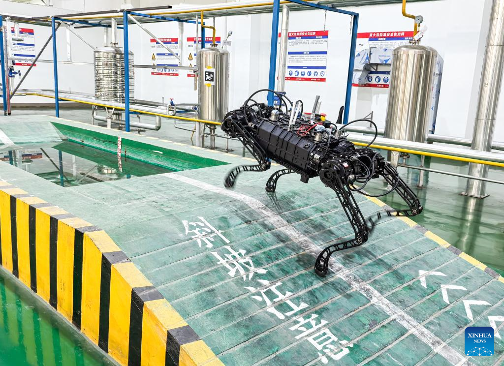 An explosion-proof quadruped robot is pictured during a test at Sevnce Robotics in southwest China's Chongqing Municipality, May 8, 2025. In recent years, Chongqing has taken multiple measures to promote the development of robot industry. Now it has formed a whole robot industry chain covering R&D, complete machine manufacturing, testing, system integration, parts matching, talent training and application services.