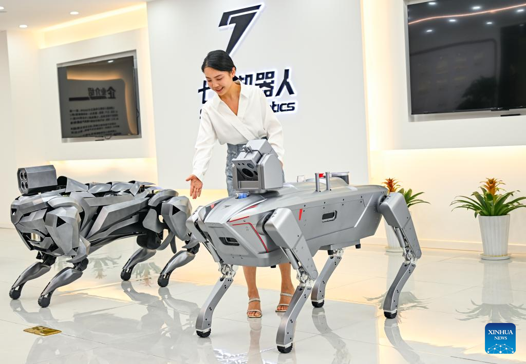 A staff member introduces explosion-proof quadruped robots at Sevnce Robotics in southwest China's Chongqing Municipality, May 27, 2025. In recent years, Chongqing has taken multiple measures to promote the development of robot industry. Now it has formed a whole robot industry chain covering R&D, complete machine manufacturing, testing, system integration, parts matching, talent training and application services.