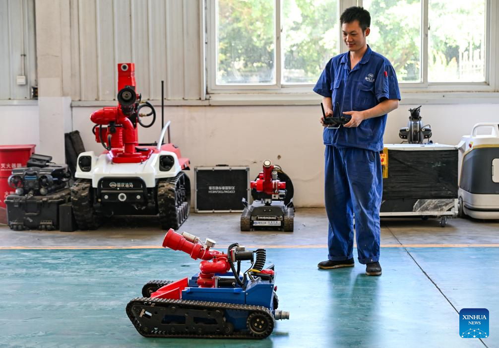 A staff member debugs a fire-fighting robot at Chongqing Dima Industry Co., Ltd. in southwest China's Chongqing Municipality, May 29, 2025. In recent years, Chongqing has taken multiple measures to promote the development of robot industry. Now it has formed a whole robot industry chain covering R&D, complete machine manufacturing, testing, system integration, parts matching, talent training and application services.