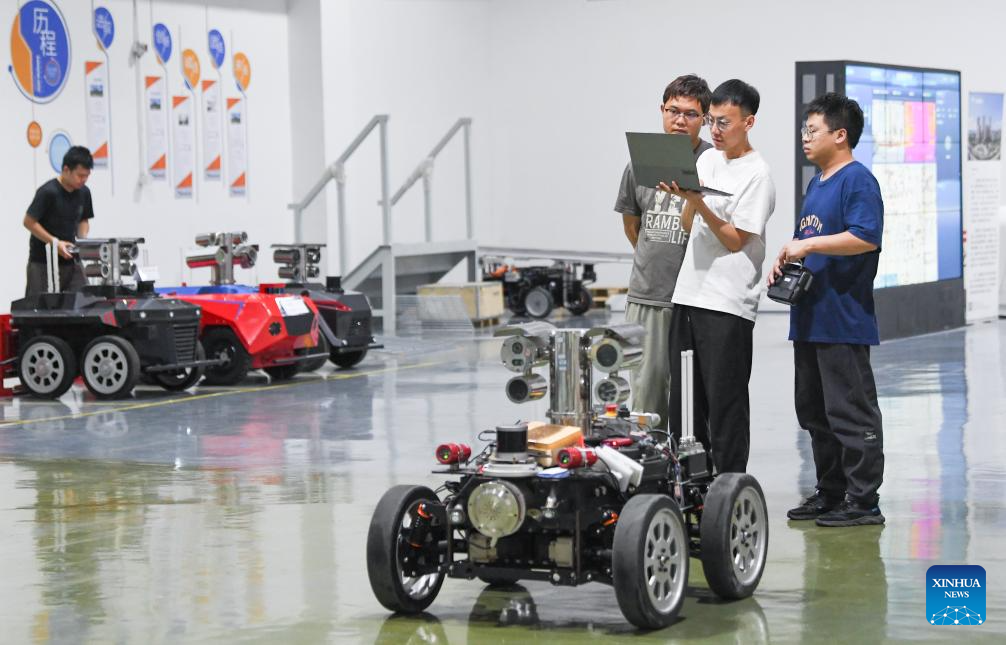 Technicians debug an explosion-proof wheeled robot at Sevnce Robotics in southwest China's Chongqing Municipality, May 27, 2025. In recent years, Chongqing has taken multiple measures to promote the development of robot industry. Now it has formed a whole robot industry chain covering R&D, complete machine manufacturing, testing, system integration, parts matching, talent training and application services.