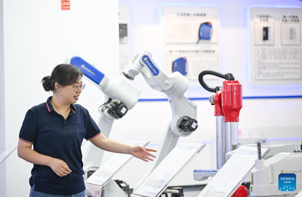 A staff member introduces industrial robots at Huashu Robot in southwest China's Chongqing Municipality, May 15, 2025. In recent years, Chongqing has taken multiple measures to promote the development of robot industry. Now it has formed a whole robot industry chain covering R&D, complete machine manufacturing, testing, system integration, parts matching, talent training and application services.