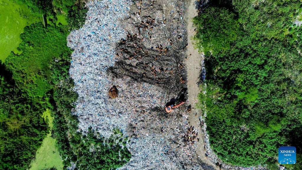 An aerial drone photo shows an excavator at Alue Lim landfill before the upcoming World Environment Day in Lhokseumawe, Aceh province, Indonesia, May 30, 2025. This year's World Environment Day falls on June 5, focusing on combating plastic pollution. (Photo by Fachrul Reza/Xinhua)