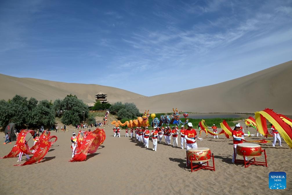 A dragon dance team performs for tourists during a celebration of the Dragon Boat Festival at the Mingsha Mountain and Crescent Spring scenic area in Dunhuang, northwest China's Gansu Province, on May 31, 2025. The Dragon Boat Festival, also known as Duanwu Festival, is a traditional Chinese holiday to commemorate ancient Chinese poet Qu Yuan from the Warring States Period (475-221 B.C.). Celebrated on the fifth day of the fifth month of the Chinese lunar calendar, the festival falls on May 31 this year. (Photo by Zhang Xiaoliang/Xinhua)