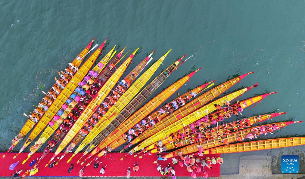 An aerial drone photo taken on May 31, 2025 shows dragon boat teams rallied on the Wuyang River in Zhenyuan County of Qiandongnan Miao and Dong Autonomous Prefecture, southwest China's Guizhou Province. The Dragon Boat Festival, also known as Duanwu Festival, is a traditional Chinese holiday to commemorate ancient Chinese poet Qu Yuan from the Warring States Period (475-221 B.C.). Celebrated on the fifth day of the fifth month of the Chinese lunar calendar, the festival falls on May 31 this year. (Photo by Yuan Fuhong/Xinhua)