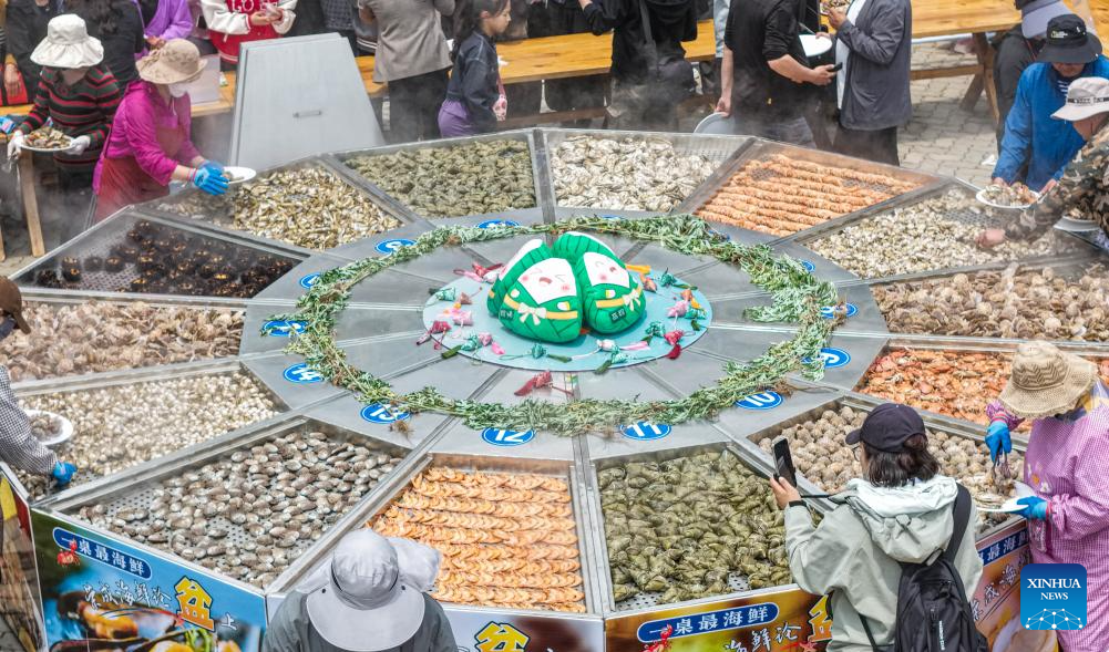 A drone photo taken on May 31, 2025 shows a scene at a seafood communal feast during a celebration of the Dragon Boat Festival at Chengshantou scenic area in Rongcheng City, east China's Shandong Province. The Dragon Boat Festival, also known as Duanwu Festival, is a traditional Chinese holiday to commemorate ancient Chinese poet Qu Yuan from the Warring States Period (475-221 B.C.). Celebrated on the fifth day of the fifth month of the Chinese lunar calendar, the festival falls on May 31 this year. (Photo by Li Xinjun/Xinhua)