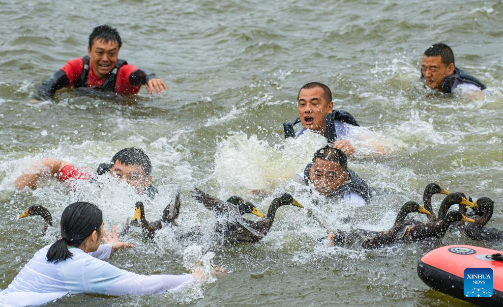 Dragon boat rowers play a duck-catching game in Wutongqiao District of Leshan City, southwest China's Sichuan Province, on May 31, 2025. The Dragon Boat Festival, also known as Duanwu Festival, is a traditional Chinese holiday to commemorate ancient Chinese poet Qu Yuan from the Warring States Period (475-221 B.C.). Celebrated on the fifth day of the fifth month of the Chinese lunar calendar, the festival falls on May 31 this year. (Photo by Kong Sheng/Xinhua)