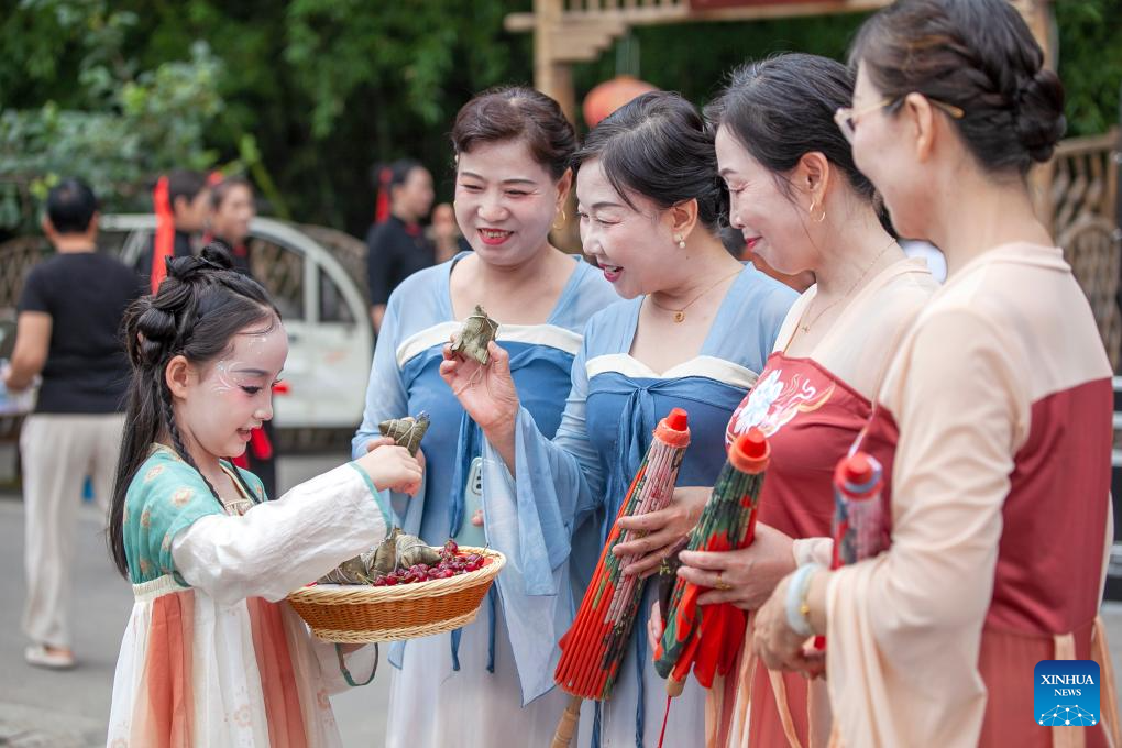 A girl presents zongzi, a traditional Chinese food to mark the Dragon Boat Festival, to tourists in Bo'ai County of Jiaozuo City, central China's Henan Province, on May 31, 2025. The Dragon Boat Festival, also known as Duanwu Festival, is a traditional Chinese holiday to commemorate ancient Chinese poet Qu Yuan from the Warring States Period (475-221 B.C.). Celebrated on the fifth day of the fifth month of the Chinese lunar calendar, the festival falls on May 31 this year. (Photo by Cheng Quan/Xinhua)