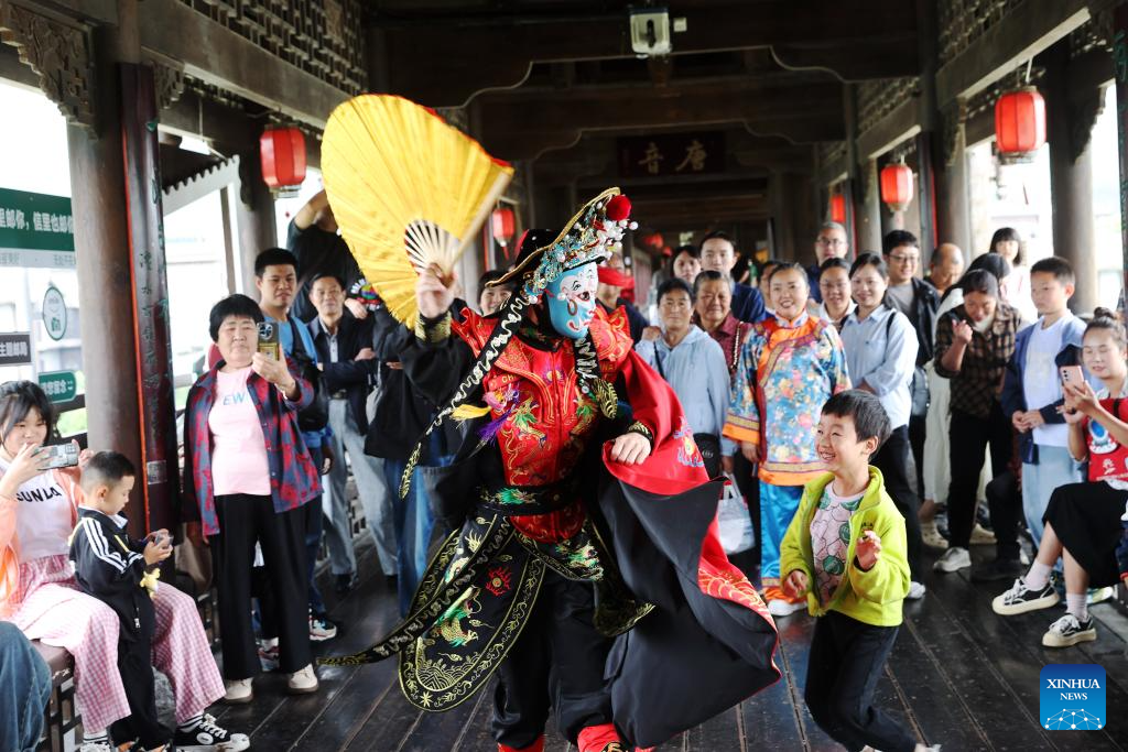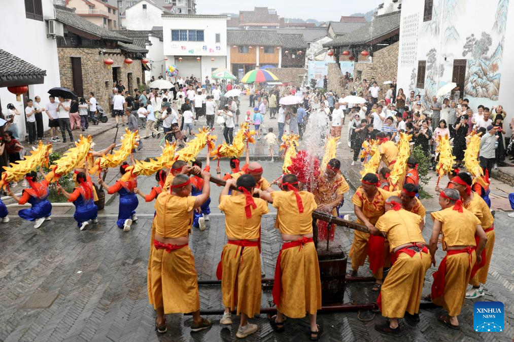 Villagers stage a traditional folk performance for tourists during a celebration of the Dragon Boat Festival in Tonglu County of Hangzhou City, east China's Zhejiang Province, on May 31, 2025. The Dragon Boat Festival, also known as Duanwu Festival, is a traditional Chinese holiday to commemorate ancient Chinese poet Qu Yuan from the Warring States Period (475-221 B.C.). Celebrated on the fifth day of the fifth month of the Chinese lunar calendar, the festival falls on May 31 this year. (Photo by Xu Junyong/Xinhua)