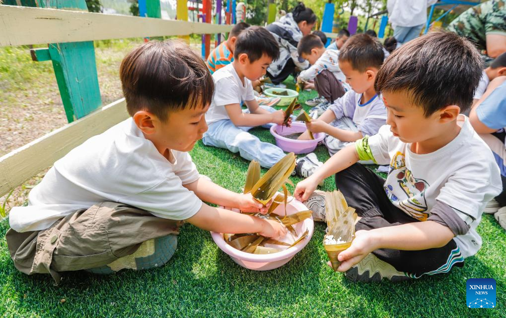 Children try their hands at making zongzi, a traditional Chinese food to mark the Dragon Boat Festival, at a nature education base in Xiaochang Township of Zunhua City, north China's Hebei Province, on May 30, 2025. The Dragon Boat Festival, also known as Duanwu Festival, is a traditional Chinese holiday to commemorate ancient Chinese poet Qu Yuan from the Warring States Period (475-221 B.C.). Celebrated on the fifth day of the fifth month of the Chinese lunar calendar, the festival falls on May 31 this year. (Photo by Liu Mancang/Xinhua)