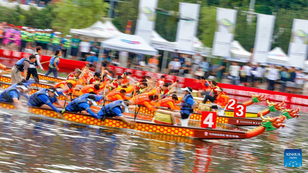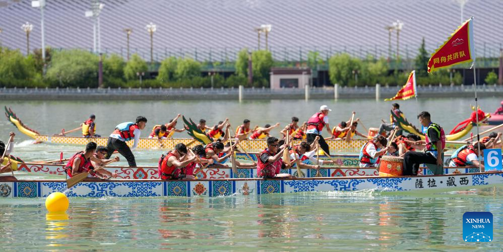 Teams compete in a dragon boat race on waters of a park in Lhasa, southwest China's Xizang Autonomous Region, on May 31, 2025. The Dragon Boat Festival, also known as Duanwu Festival, is a traditional Chinese holiday to commemorate ancient Chinese poet Qu Yuan from the Warring States Period (475-221 B.C.). Celebrated on the fifth day of the fifth month of the Chinese lunar calendar, the festival falls on May 31 this year. (Xinhua/Jigme Dorge)