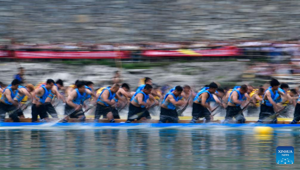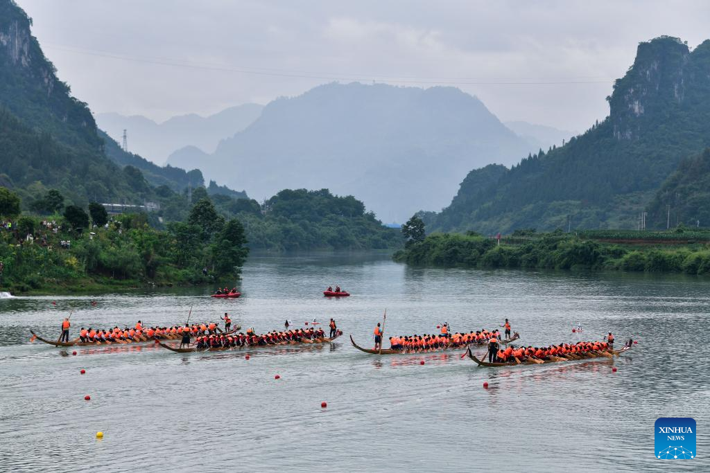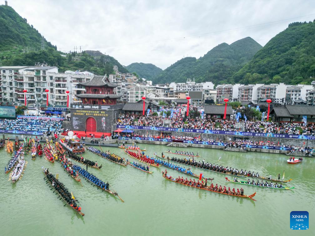 Teams compete in a dragon boat race on the Jinjiang River in Bijiang District of Tongren city, southwest China's Guizhou Province, on May 31, 2025. The Dragon Boat Festival, also known as Duanwu Festival, is a traditional Chinese holiday to commemorate ancient Chinese poet Qu Yuan from the Warring States Period (475-221 B.C.). Celebrated on the fifth day of the fifth month of the Chinese lunar calendar, the festival falls on May 31 this year. (Xinhua/Yang Wenbin)