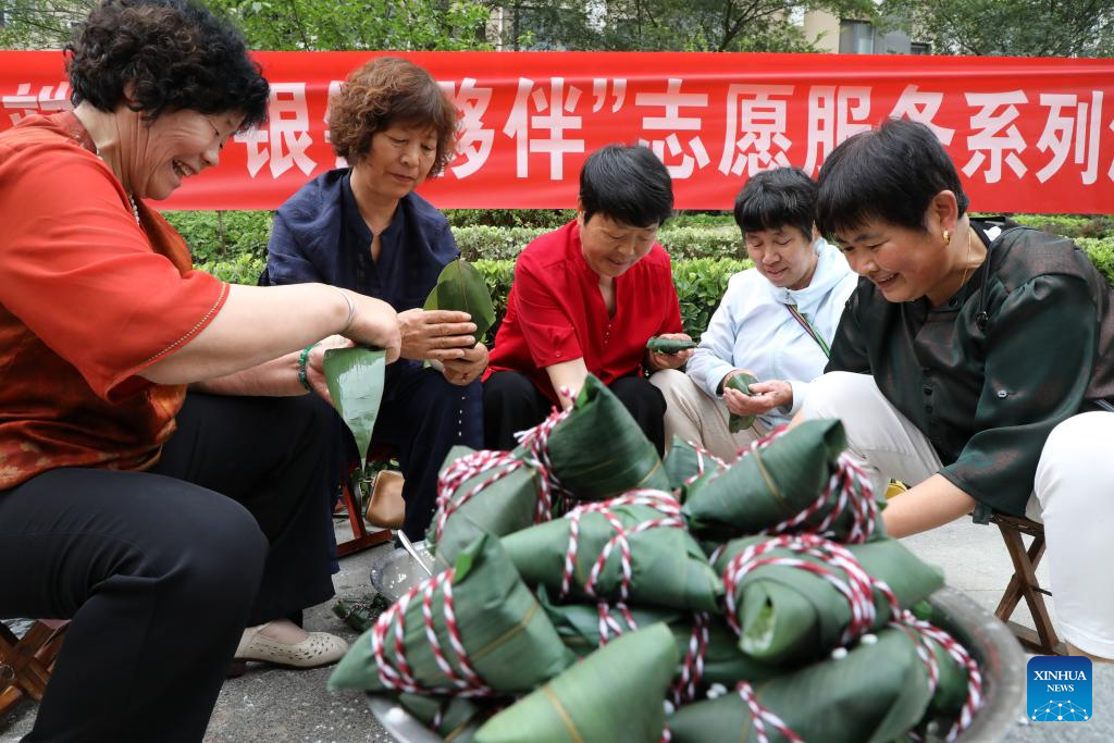 Residents make zongzi, a traditional Chinese food to mark the Dragon Boat Festival, in Jinxiu neighborhood of Boxing County, Binzhou City, east China's Shandong Province, on May 31, 2025. The Dragon Boat Festival, also known as Duanwu Festival, is a traditional Chinese holiday to commemorate ancient Chinese poet Qu Yuan from the Warring States Period (475-221 B.C.). Celebrated on the fifth day of the fifth month of the Chinese lunar calendar, the festival falls on May 31 this year. (Photo by Chen Bin/Xinhua)