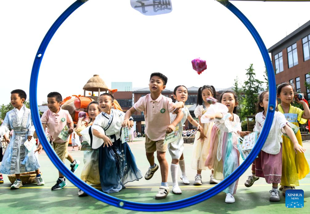 Children play a traditional game of "stoning the five pests" during a celebration of the Dragon Boat Festival at a kindergarten in Jiyuan City, central China's Henan province, May 30, 2025. The Dragon Boat Festival, also known as Duanwu Festival, is a traditional Chinese holiday to commemorate ancient Chinese poet Qu Yuan from the Warring States Period (475-221 B.C.). Celebrated on the fifth day of the fifth month of the Chinese lunar calendar, the festival falls on May 31 this year. (Photo by Miao Qiunao/Xinhua)