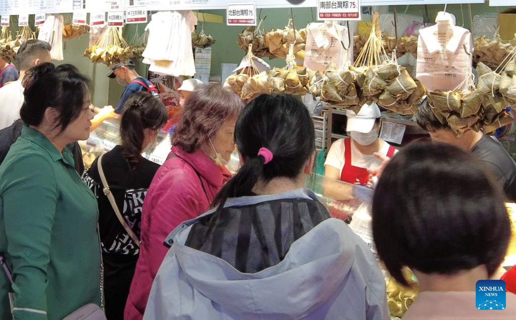 Customers buy zongzi, a traditional Chinese food to mark the Dragon Boat Festival, at Nanmen market in Taipei, southeast China's Taiwan, on May 29, 2025. The Dragon Boat Festival, also known as Duanwu Festival, is a traditional Chinese holiday to commemorate ancient Chinese poet Qu Yuan from the Warring States Period (475-221 B.C.). Celebrated on the fifth day of the fifth month of the Chinese lunar calendar, the festival falls on May 31 this year. (Xinhua/Li Yue)