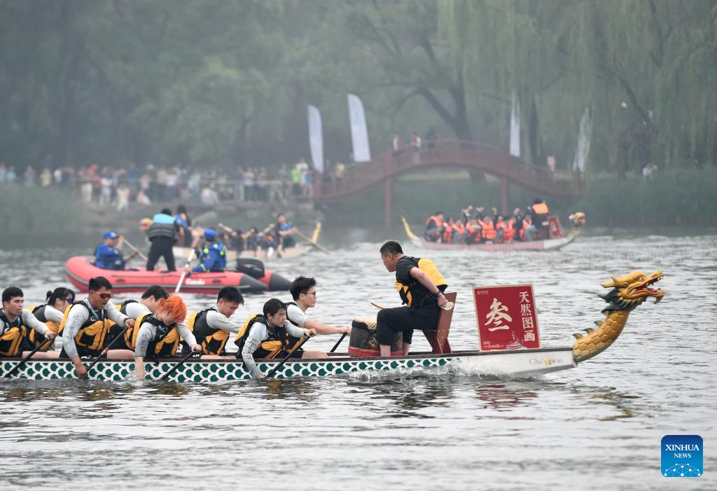 Teams from Beijing-based colleges compete in a dragon boat race on a lake at Yuanmingyuan Park in Beijing, capital of China, on May 31, 2025. The Dragon Boat Festival, also known as Duanwu Festival, is a traditional Chinese holiday to commemorate ancient Chinese poet Qu Yuan from the Warring States Period (475-221 B.C.). Celebrated on the fifth day of the fifth month of the Chinese lunar calendar, the festival falls on May 31 this year. (Xinhua/Luo Xiaoguang)