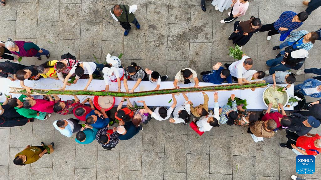 Citizens jointly make a 10-meter-long, dragon-boat-shaped zongzi, a traditional Chinese food to mark the Dragon Boat Festival, in Luzhou City, southwest China's Sichuan Province, on May 31, 2025. The Dragon Boat Festival, also known as Duanwu Festival, is a traditional Chinese holiday to commemorate ancient Chinese poet Qu Yuan from the Warring States Period (475-221 B.C.). Celebrated on the fifth day of the fifth month of the Chinese lunar calendar, the festival falls on May 31 this year. (Photo by Yang Shangwei/Xinhua)