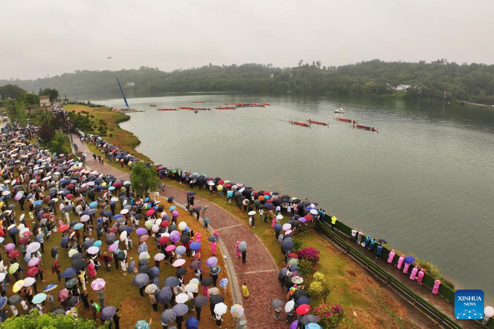 An aerial drone photo taken on May 31, 2025 shows teams competing in a dragon boat race at Longnv Lake by Jialing River in Wusheng County, Guang'an City, southwest China's Sichuan Province. The Dragon Boat Festival, also known as Duanwu Festival, is a traditional Chinese holiday to commemorate ancient Chinese poet Qu Yuan from the Warring States Period (475-221 B.C.). Celebrated on the fifth day of the fifth month of the Chinese lunar calendar, the festival falls on May 31 this year. (Photo by Xia Junlin/Xinhua)