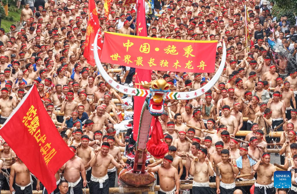 An aerial drone photo taken on May 31, 2025 shows people shouldering an extra-long dragon boat during a parade in celebration of the Dragon Boat Festival in Shibing County, southwest China's Guizhou Province, on May 31, 2025. The Dragon Boat Festival, also known as Duanwu Festival, is a traditional Chinese holiday to commemorate ancient Chinese poet Qu Yuan from the Warring States Period (475-221 B.C.). Celebrated on the fifth day of the fifth month of the Chinese lunar calendar, the festival falls on May 31 this year. (Photo by Mo Guibin/Xinhua)