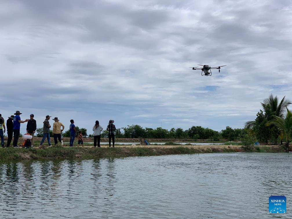 Experts from Shanghai Ocean University provide training for Cambodian farmers to use drones to distribute feed in rice fields and aquaculture ponds in Takeo province, Cambodia on May 31, 2025. (Photo by Van Pov/Xinhua)